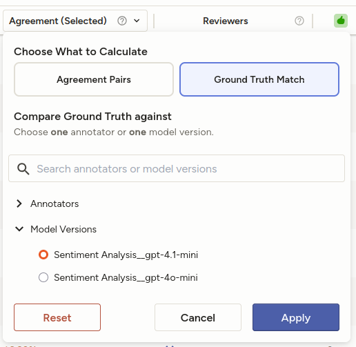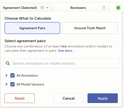 If your project contains ground truth annotations, this allows you to compare either a single annotator or a single model to ground truth annotations.