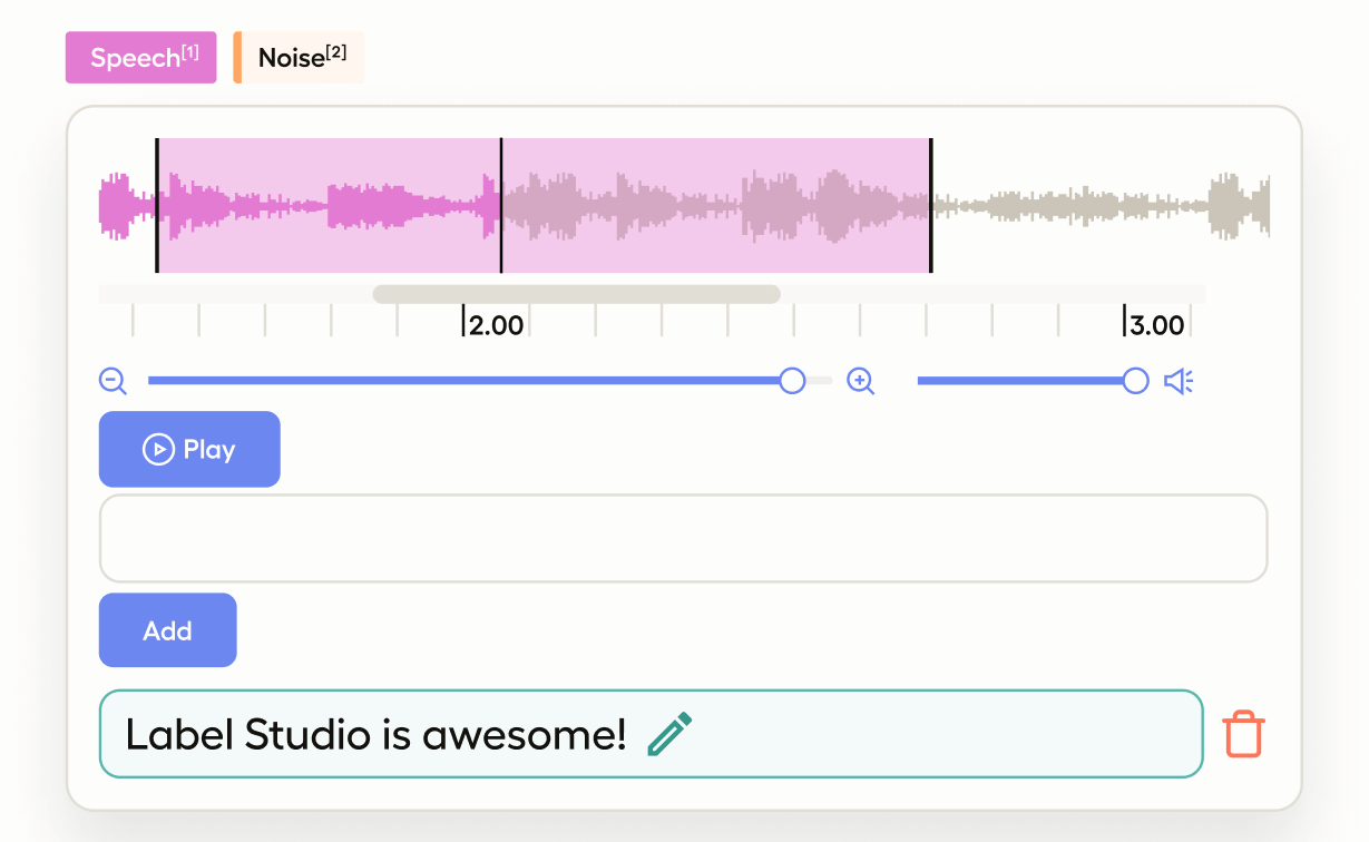 Use the Audio object tag to display a waveform of audio that can be labeled: